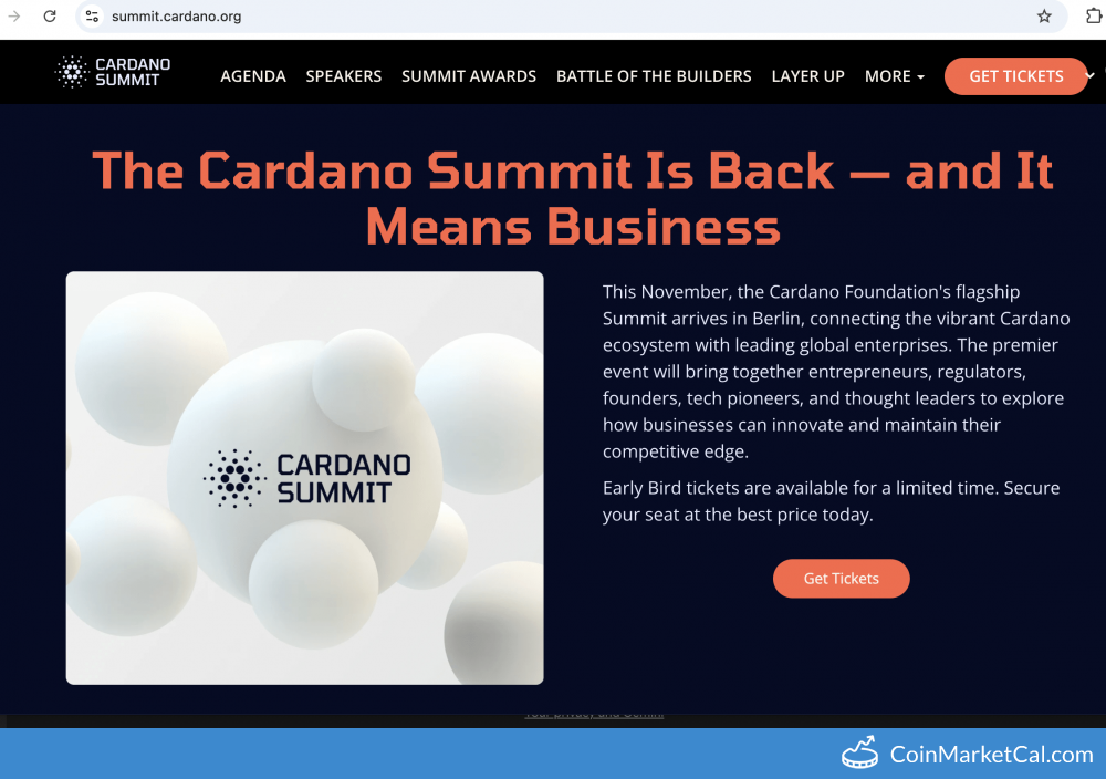 | 12.11.2025 | Cardano Summit 2025 | Conference | USDA : Anzens USDA ADA : Cardano CRYPTO : General Event IAG : Iagon KAI : KAIKO LQ : Liqwid Finance $NMKR : NMKR NVL : Nuvola Digital PLASTIK : Plastiks WAN : Wanchain | ![]() | Detay |