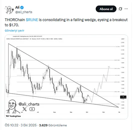 Piyasa analisti Ali Martinez THORChain’in kripto para birimi RUNE için düşen takoz formasyonuna işaret eden bir grafiği 03 Ekim 2025 tarihinde X‘ten paylaştı. Analiste göre parite, bu sıkışmayı yukarı kırması hzlinde 1,70 dolar bölgesine doğru bir atak deneyebilir.